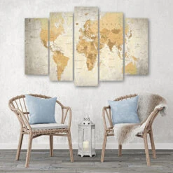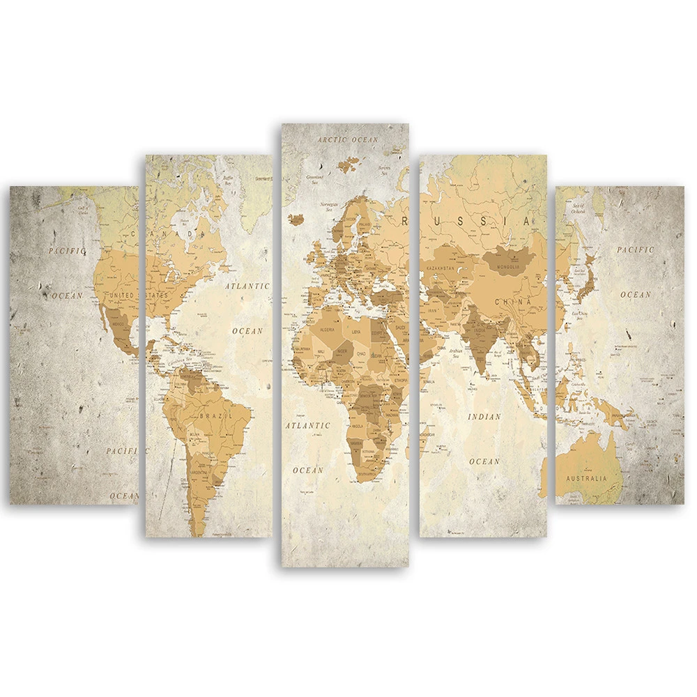 5 Piece Canvas Print, World Map Brown