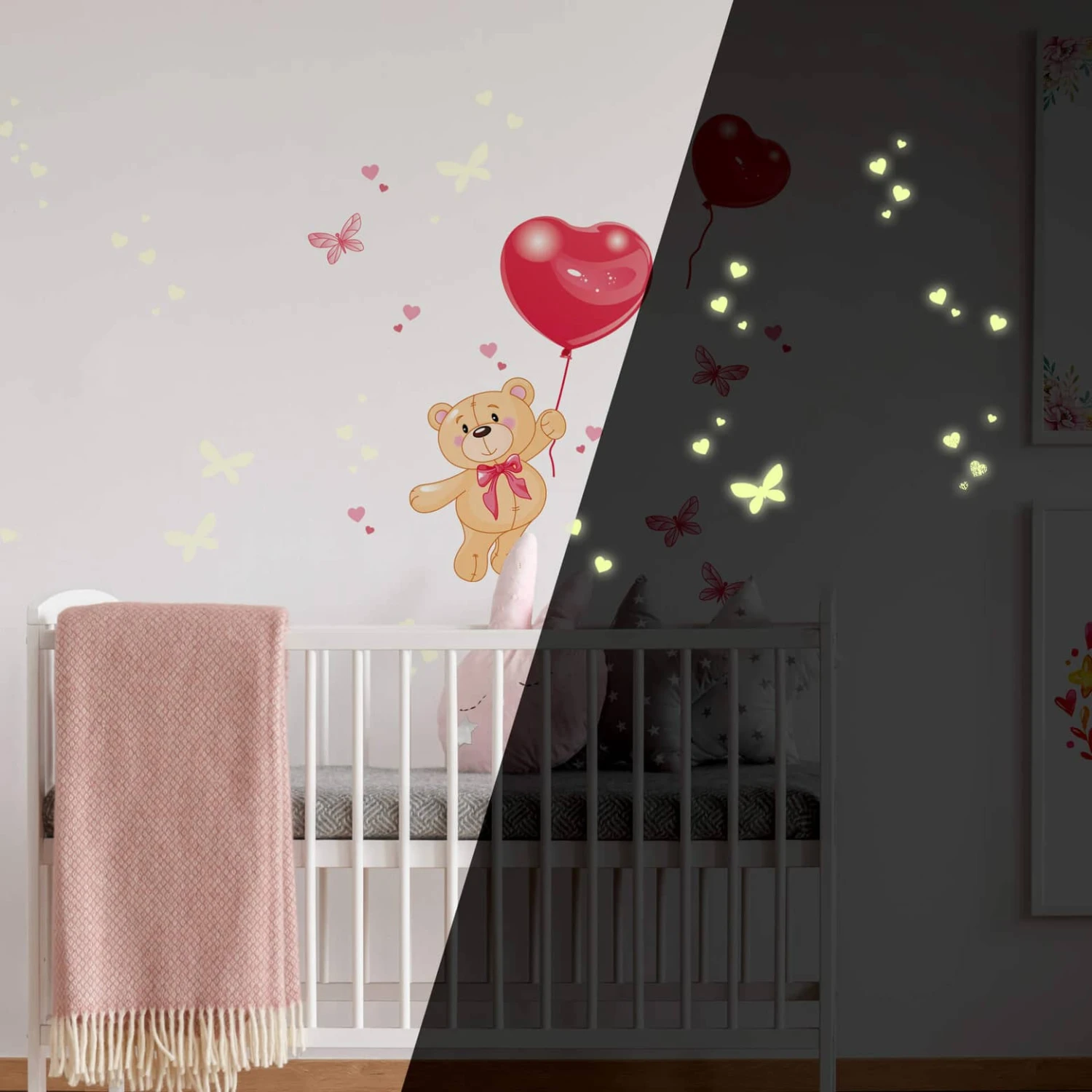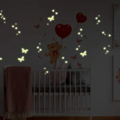 This wall sticker is a great combination of a cute bear with balloons surrounded by glow in the dark stickers. The sticker is available in various sizes. Because you can stick the glow in the dark stickers to any smooth surface you can apply them to the wall, to a door, bed or closet.