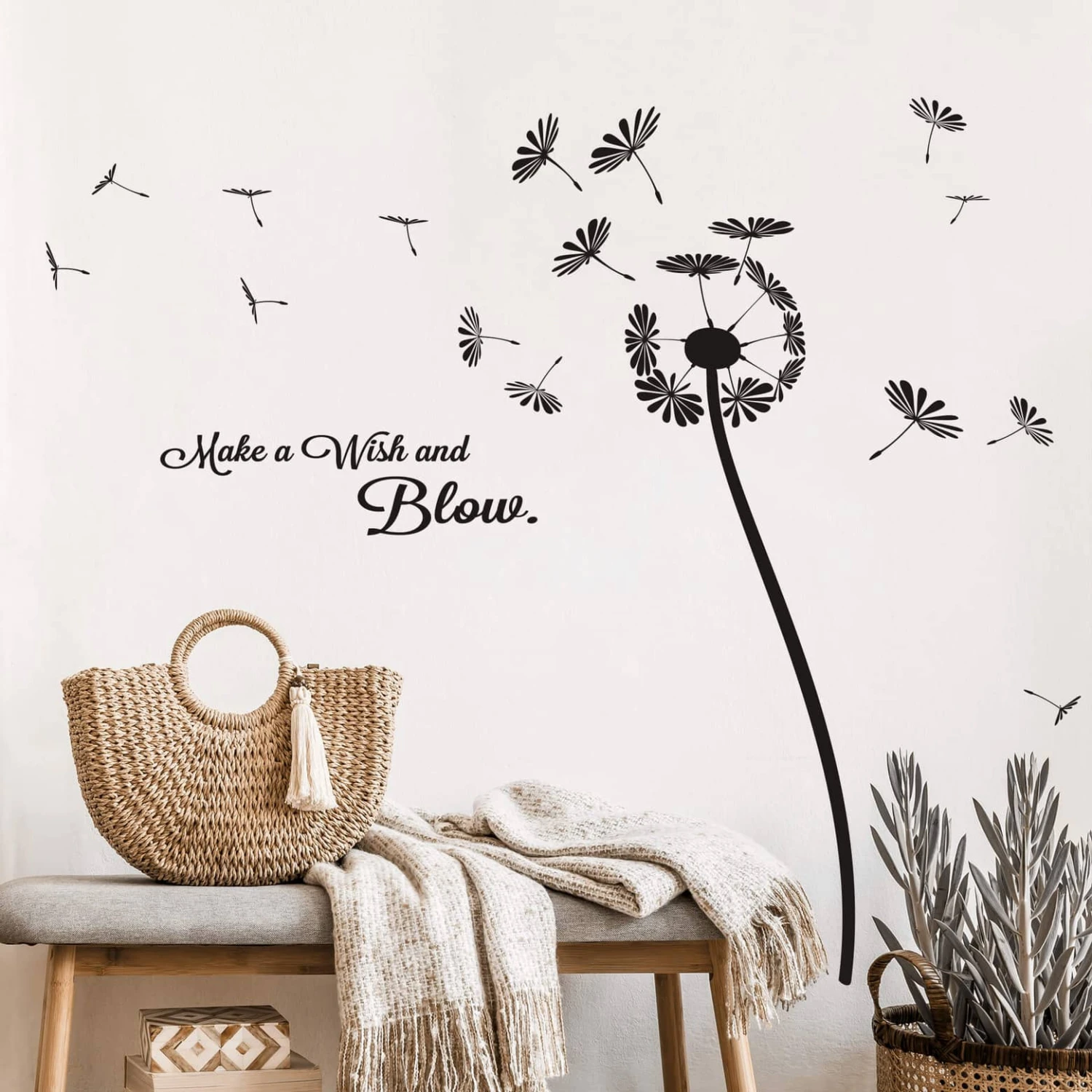 We all remember being a young and blowing dandelions, it was one of the most magical things to do when you where a child. The sight of watching all those tiny seeds with their fluffy hats fly away until they slowly float to the ground where they would settle for a new generation of dandelions. It is one of those vivid childhood memories that will stay with us forever and some of us still enjoy to do it from time to time. If you adore those little wonders of nature as much as we do, then our Poetic Dandelion Wall Sticker is probably what you are looking for.Â