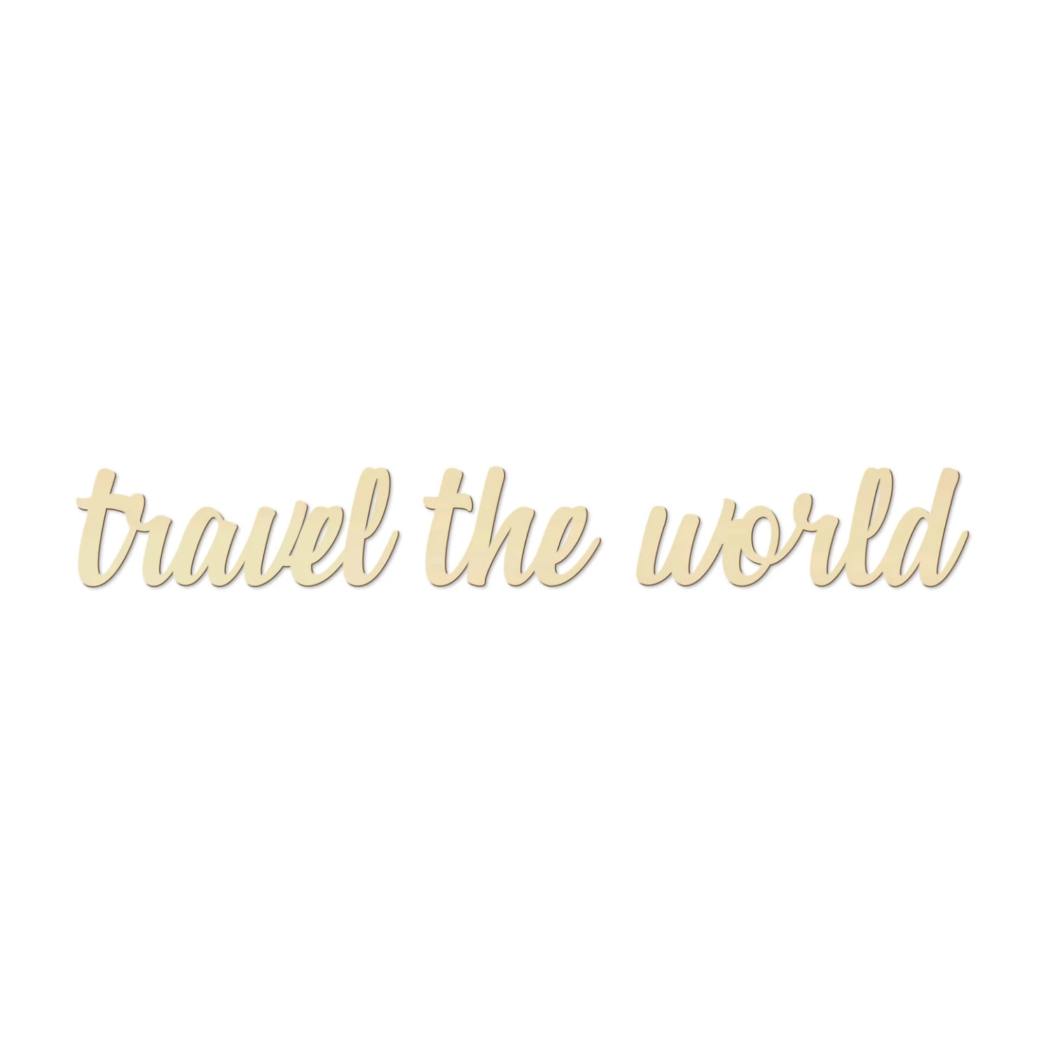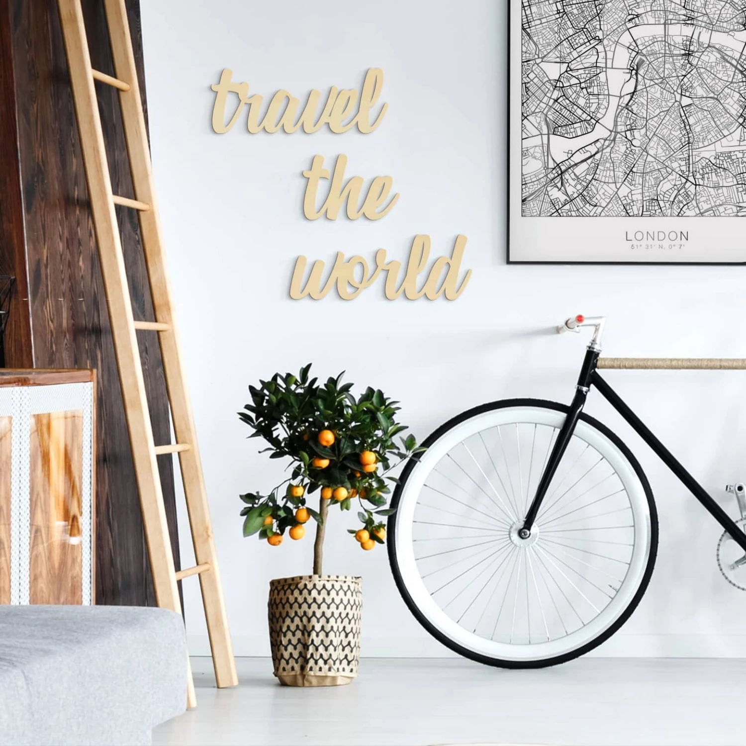 Exploring the world always involves a lot. You meet new people, experience many adventures and see a lot of nature and what the world has to offer. This saying “Travel teh World” is intended to encourage you to set out and explore the world. Experience exciting adventures and get to know other countries.??For the attachment of the wooden decoration, we recommend our Tesa Tack adhesive clay (80 pieces), which you can order as a complementary product right away.??This stylish wooden decoration is available in the following sizes:??Size 1: 50×48 cm??Size 2: 60×58 cm??Size 3: 70×67 cm