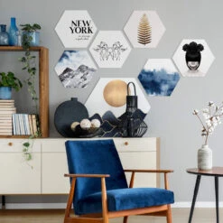 Create a unique gallery on your wall with our hexagonal wall decorations. Our honeycomb or hexagon wall prints can brighten up a boring wall in a beautiful way. The individual decorative elements can not only be hung individually, but can also be combined as a set and be further expanded at any time. At wall-art you can choose hexagon wall decorations with various images, but also in different materials. Whether it’s wood, aluminum dibond with metallic effects or wall stickers in hexagon shape – you’ll find it in our online shop. The hexagons of alu-dibond are perfect for an industrial and modern interior. The image is printed on sturdy 3 mm aluminium.
