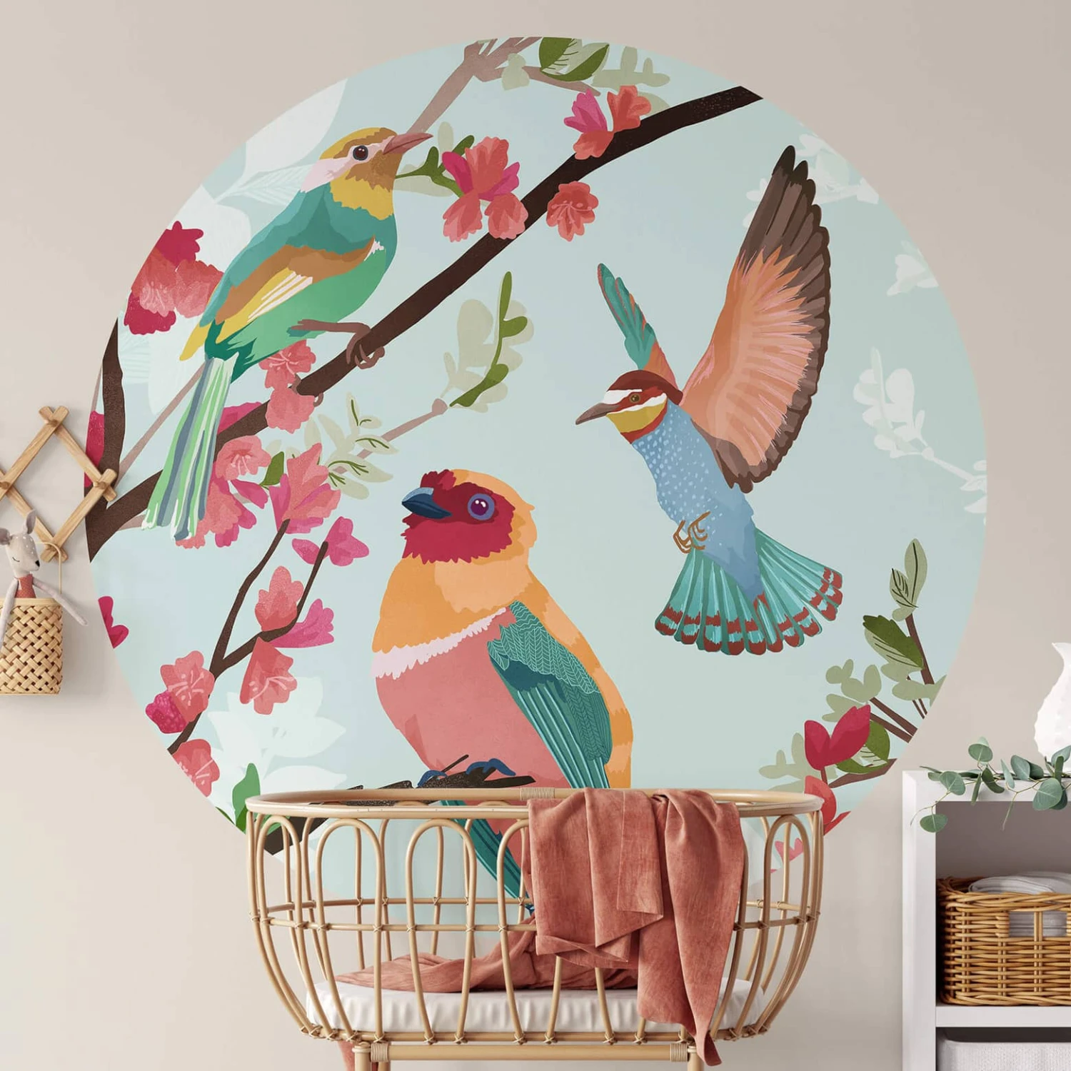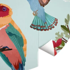 A beautiful design by artist duo Goed Blauw. Colorful birds enjoying a warm summer day. Nothing is better than getting home after a long day at work or school. Feeling comfortable and at ease in your very own home is more important than ever. Working from home, studying from home or simply wanting to have a little time for yourself at home after a pretty long day with the children. Having an interior that you love makes being at home so much better. Wall decor is very important in creating the atmosphere you love. We are all familiar with canvas prints and wallpaper on our walls, but round wallpaper is most definitely the new trend you see everywhere at the moment. At wall-art.com we offer a large selection of round wallpapers in various styles. You can be sure to find a beautiful round wallpaper for your home. Our round wallpapers are perfect for lower budgets. Our wallpaper prices are low. We are able to offer round wallpapers at great prices because we do not cut your wallpaper into a circle before you receive it. We deliver your wallpaper with a cutting template and all you have to do is cut it with a sharp knife by using the cutting template. It is a fun DIY thing to do and very easy!