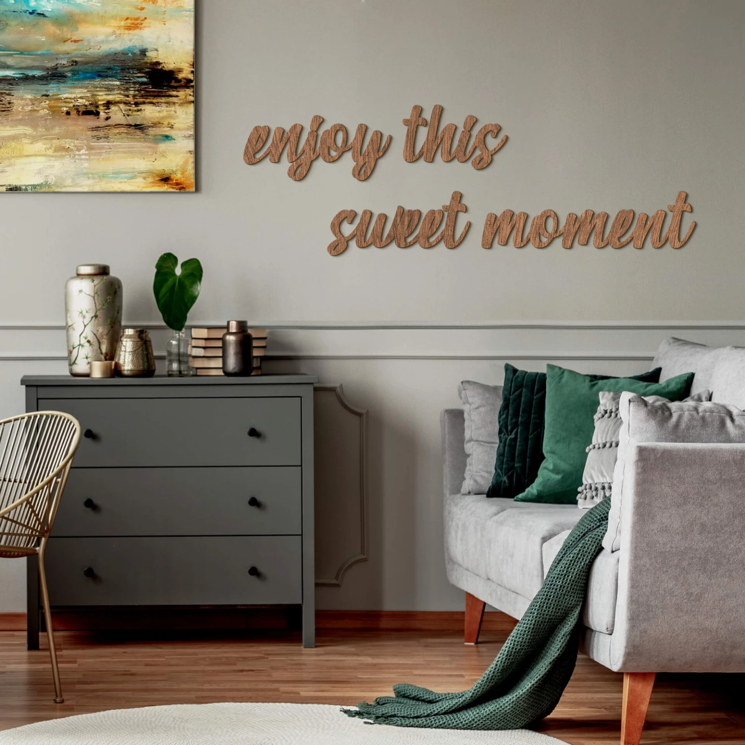 In life there are so many moments that you either want to get over quickly or never forget again. This saying shows you that you just have to enjoy the beautiful moments. Because such moments make it possible to see something good even in the bad moments.??For the attachment of wooden letters, we recommend our Tesa Tack adhesive clay (80 pieces), which you can order as a complementary product immediately.??These stylish wooden letters consist of 4 parts and are available in the following sizes:??Size 1: 130×15 cm??Size 2: 173×20 cm??Size 3: 260×30 cm??Size 4: 346×40 cm