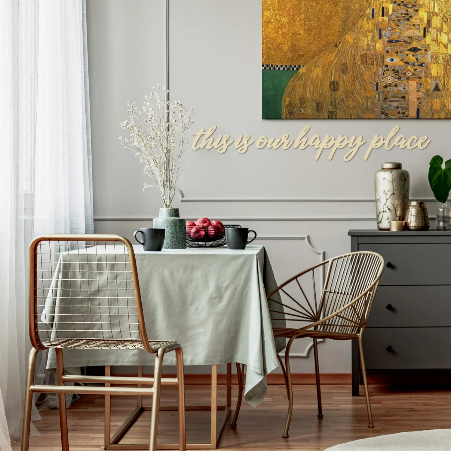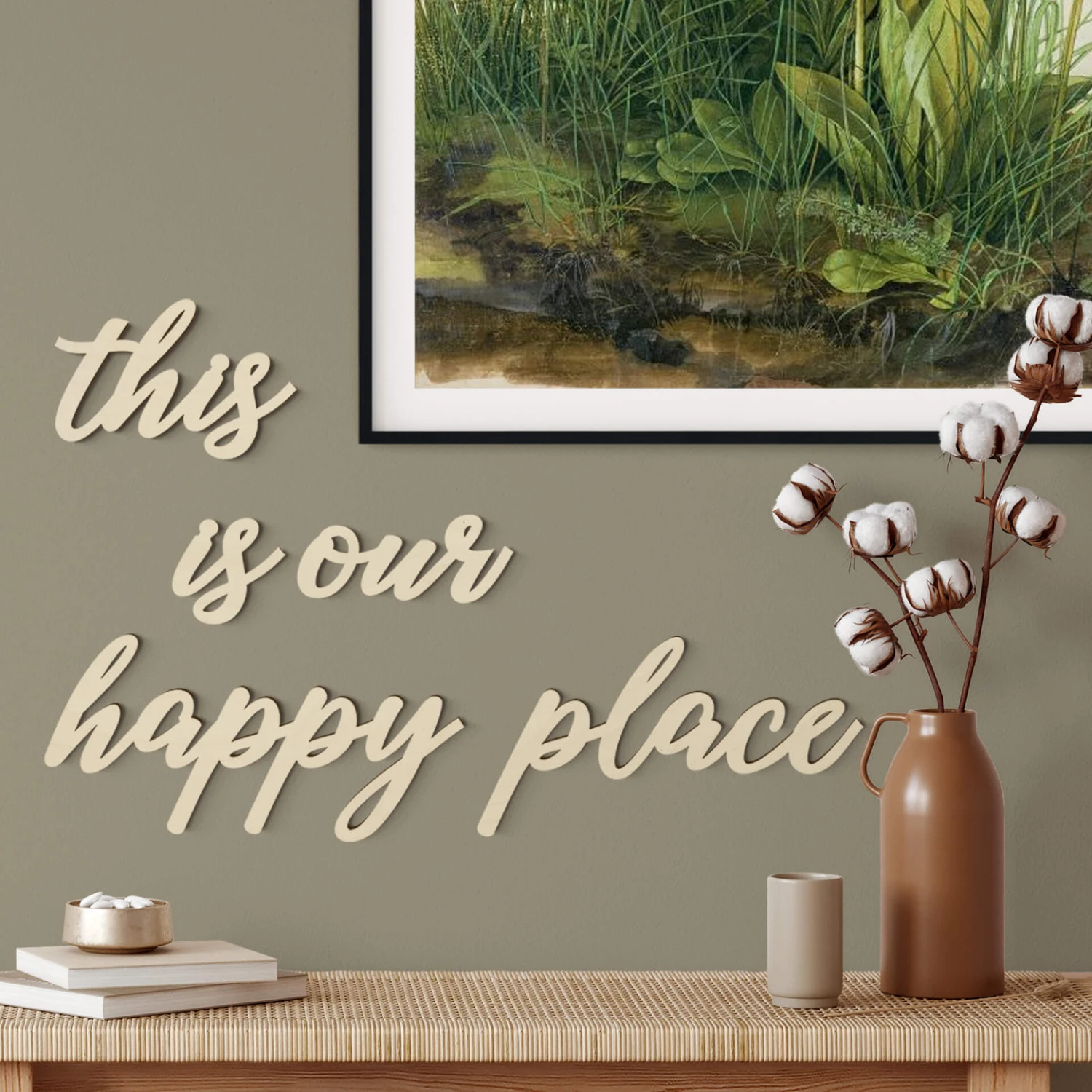 Your personal photos capture unforgettable moments that you will never forget. Unique experiences and dreamlike moments are the memories that make us what we are today and what we like to remember. With the saying “This is our happy place”, this is our happy place, make your favorite corner with your best memories that will make you a happy person.??The wooden letters can be glued to the wall with our adhesive pads.??The wooden decoration is available in the following sizes:??100×15 cm?133×20 cm?200×30 cm?267×40 cm